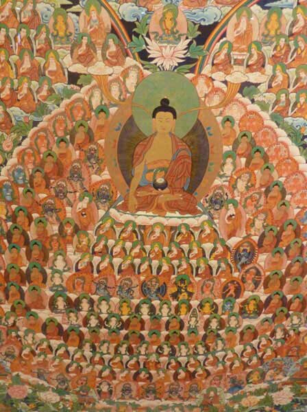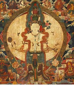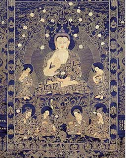 日本東方研究會的田中公明表示,唐卡是曾在印度繁榮一時的軸裝佛畫,后被傳入西藏。然而將形成于印度的佛教經(jīng)典內(nèi)容忠實繪制出來的實例迄今卻寥寥無幾,只有在絲綢之路的綠洲——黑水城出土的12—13世紀(jì)的一幅唐卡被認(rèn)定為寶樓閣曼荼羅,它處于唐卡與曼荼羅的中間形態(tài),是敘景式曼荼羅之一。[詳細(xì)]