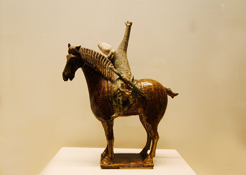 騎馬出游和狩獵是唐代上層階級(jí)休閑娛樂(lè)的一種方式,狩獵活動(dòng)和騎馬出游也成了唐代繪畫(huà)、雕塑、詩(shī)歌等藝術(shù)的創(chuàng)作題材。騎馬狩獵俑和出行俑便是在這種背景下的產(chǎn)物。威武的胡人和矯健的胡馬是唐代詩(shī)歌、繪畫(huà)、雕塑等藝術(shù)形式中常見(jiàn)的題材,反映了長(zhǎng)安作為國(guó)際大都會(huì)的開(kāi)放與繁榮。在騎馬或騎駝俑中,男性胡人俑比較常見(jiàn)。在這些騎馬出游和狩獵活動(dòng)中,甚至還有女性形象的出現(xiàn),由此可見(jiàn),唐朝是一個(gè)寬容開(kāi)放的朝代,婦女可不僅以拋頭露面到市街游玩,還可以參加打球、射獵等活動(dòng)。婦女騎馬在唐代繪畫(huà)、雕塑和文學(xué)中都有生動(dòng)的表現(xiàn),且常著胡服,唐代上層?jì)D女著胡服騎馬出游是一種社會(huì)風(fēng)氣。[詳細(xì)]