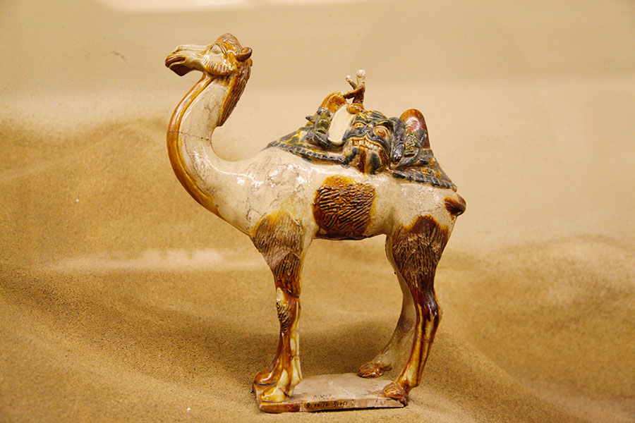 中世紀(jì)的中國(guó)具有超強(qiáng)的綜合國(guó)力和豐富的物產(chǎn),吸引了無(wú)數(shù)胡商千里迢迢來(lái)到中原?!吧衬邸?駱駝,以其默默無(wú)聲的千年負(fù)載,成為“絲綢之路”當(dāng)之無(wú)愧的象征。胡商以這種特殊的運(yùn)載工具,背負(fù)寶石、香料、瑪瑙而來(lái),又滿載絲綢、瓷器、茶葉而歸,異域的禮俗、宗教和文化也隨之紛至沓來(lái),胡風(fēng)禮俗、胡樂(lè)歌舞成為盛極一時(shí)的長(zhǎng)安風(fēng)尚。他們?yōu)闁|西方文化交流和貿(mào)易往來(lái)作出了特殊貢獻(xiàn),并播下了友誼火種。唐代強(qiáng)盛,于西域各地置都護(hù)府,使?jié)h代開(kāi)拓的“絲綢之路”重新暢通。騎駝陶俑塑造了盛唐時(shí)西域康國(guó)人東來(lái)中夏的情景,表現(xiàn)了他們?cè)谖覈?guó)經(jīng)商之暇,戲猴、騎駝漫游情趣。[詳細(xì)]