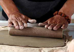在枯木陶的塑型方法上,它采用的是捏制法,不借助任何的模具,只需要一些很簡單的工具純手工操作。
